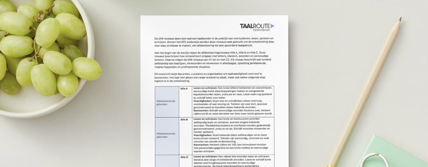 De ERK-niveaus laten zien wat een taalleerder in de praktijk kan met luisteren, lezen, spreken en schrijven. Binnen het NT2-onderwijs worden deze niveaus gebruikt om taalontwikkeling stap voor stap zichtbaar te maken, van alfabetisering tot zeer gevorderd taalgebruik.